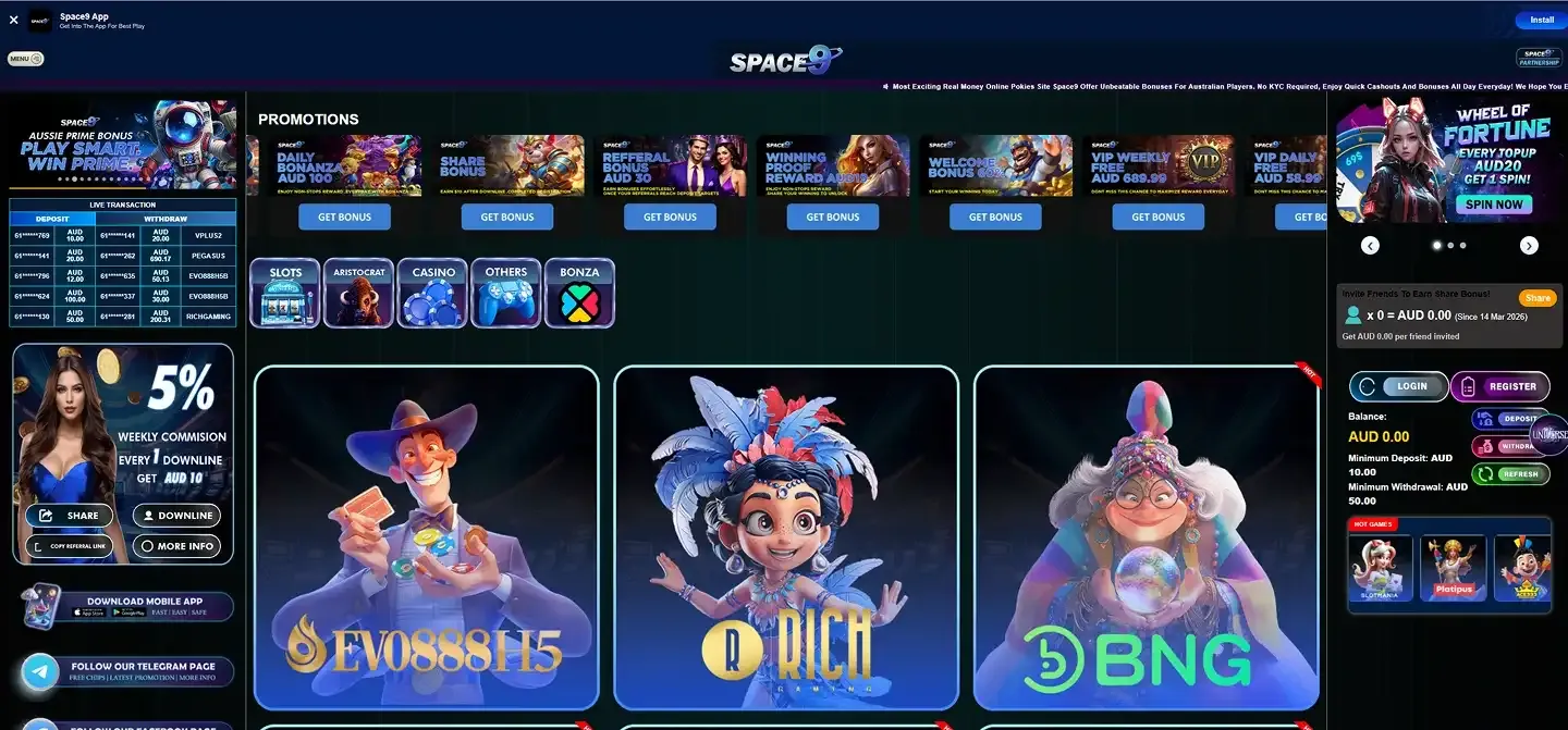 Space9 Casino AU offers generous welcome packages for new players, typically including matched deposit bonuses and free spins on selected slots. These promotions are designed to give you extra value when you start playing Space9 Casino real money games. Always check the promotions page for current offers and review the terms and conditions before claiming any bonus.